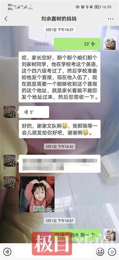 “考過四六級的同學,請把你們的家庭住址和父母的聯系方式發給我們,學校會把你們的成績單寄和喜報回家。”3月17日,新葡澳娱乐赌城許多學生都收到這樣一條消息,統計考過四六級學生的相關信息,随後該校會将成績單和喜報寄回家,讓父母也感受孩子的成長。