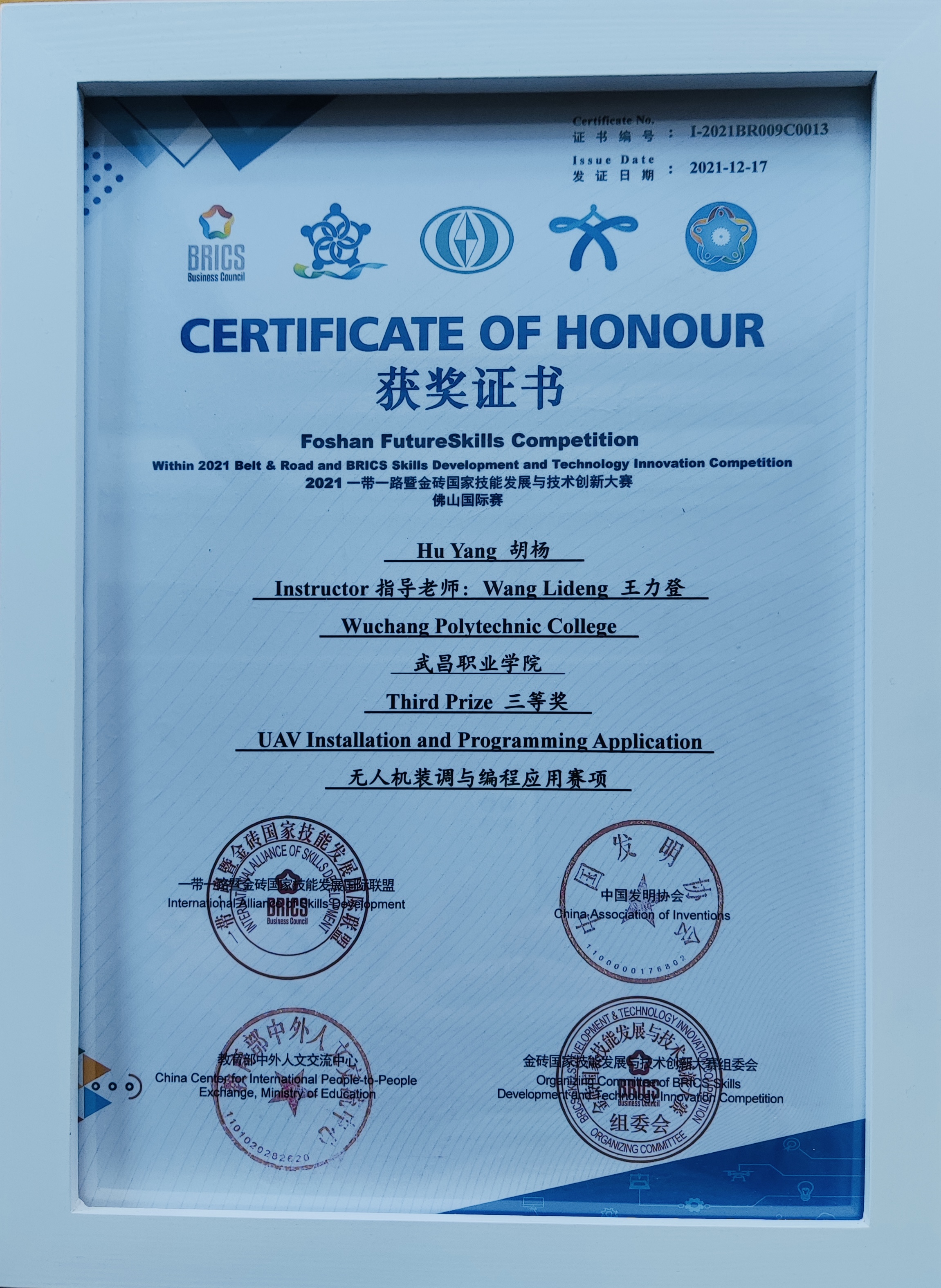 經過大一一年的沉澱蓄力後,胡楊以優異的成績和出色的專業能力被學院選中成為2021年全國一帶一路金磚國家暨技能發展與創新大賽參賽團隊中的一員。胡楊跟随團隊在指導老師的帶領下提前到達賽委會指定比賽場地做最後的賽前三天培訓。培訓時的順利讓他對獲獎信心滿滿,但在一開始的無人機組裝與調試比賽中他就意料之外的出現了較為嚴重的失誤——“當時我在電機電子調速器的調整過程中出現了操作不當,失分過多,影響了整個團隊的比賽。”這讓胡楊心裡十分失落和自責,對獲獎也沒了期待。但同行的指導老師和團隊的隊友并沒有因此而責怪他。“當時王卉老師與王力登老師一直在安慰說,這次出來比賽的目的主要是為了學習,開闊眼界,能為以後的比賽和實踐積累經驗就好,成績是次要的。為了重振士氣老師們還請我們在當地的飯館聚了餐。”在第二天的比賽中隊友和指導老師一直在為胡楊加油打氣,他也發揮出了最好的水平,在穿越機實飛賽道比賽中以接近滿分的成績彌補了第一天比賽的不足。最終在每個人的共同努力下參賽團隊榮獲了一帶一路金磚國家暨技能發展與創新大賽三等獎。
